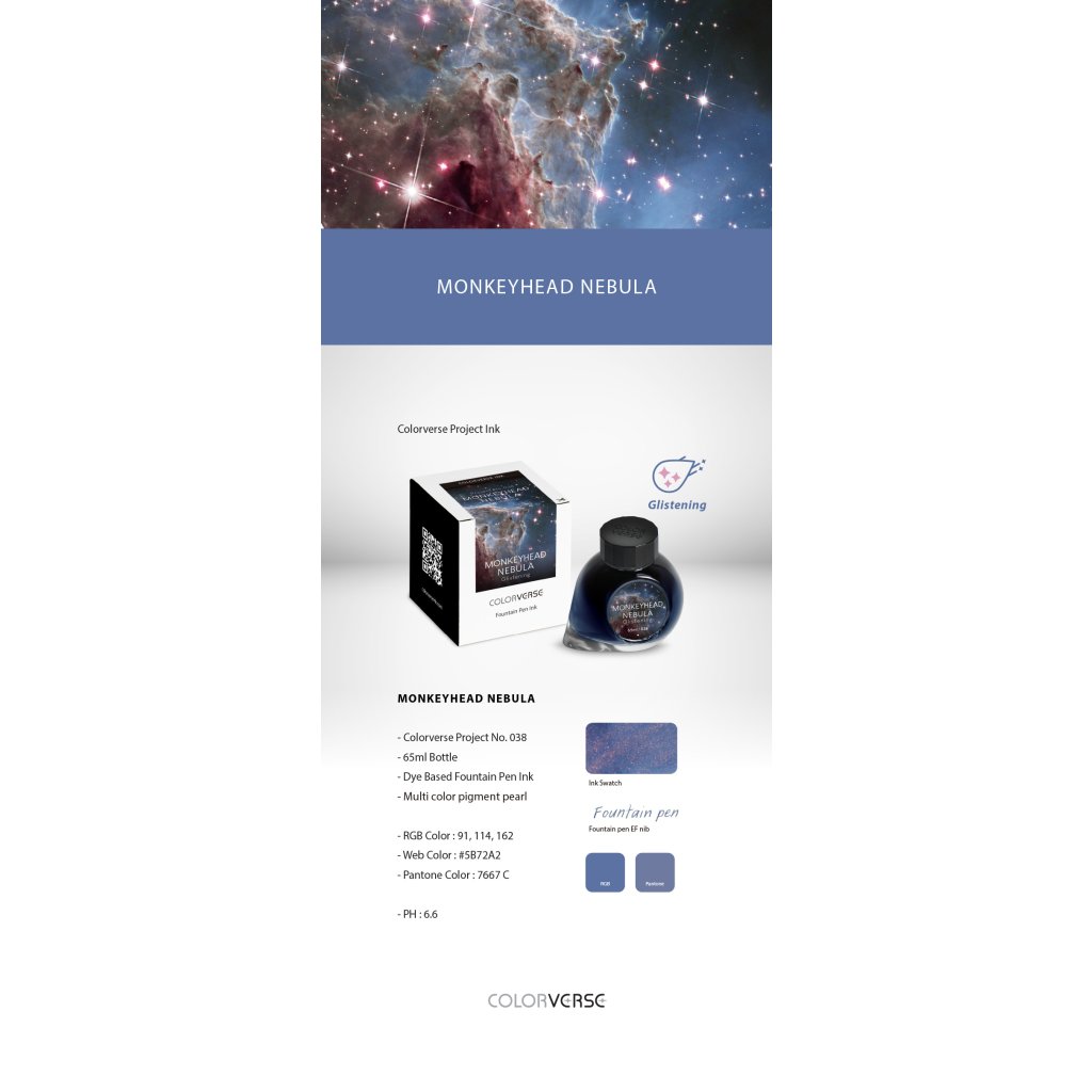 Inkousty Colorverse, inspirované prostorem a časem, vás vyzývají, abyste si „obarvili svůj vesmír“. Jsou pečlivě namíchány tak, aby do vašeho pera přenesly éterickou krásu, zázrak a intenzivní vitalitu vesmíru. Inkousty jsou vyrobeny z vysoce čistých surovin a jejich pH je optimalizováno pro dlouhou trvanlivost.
