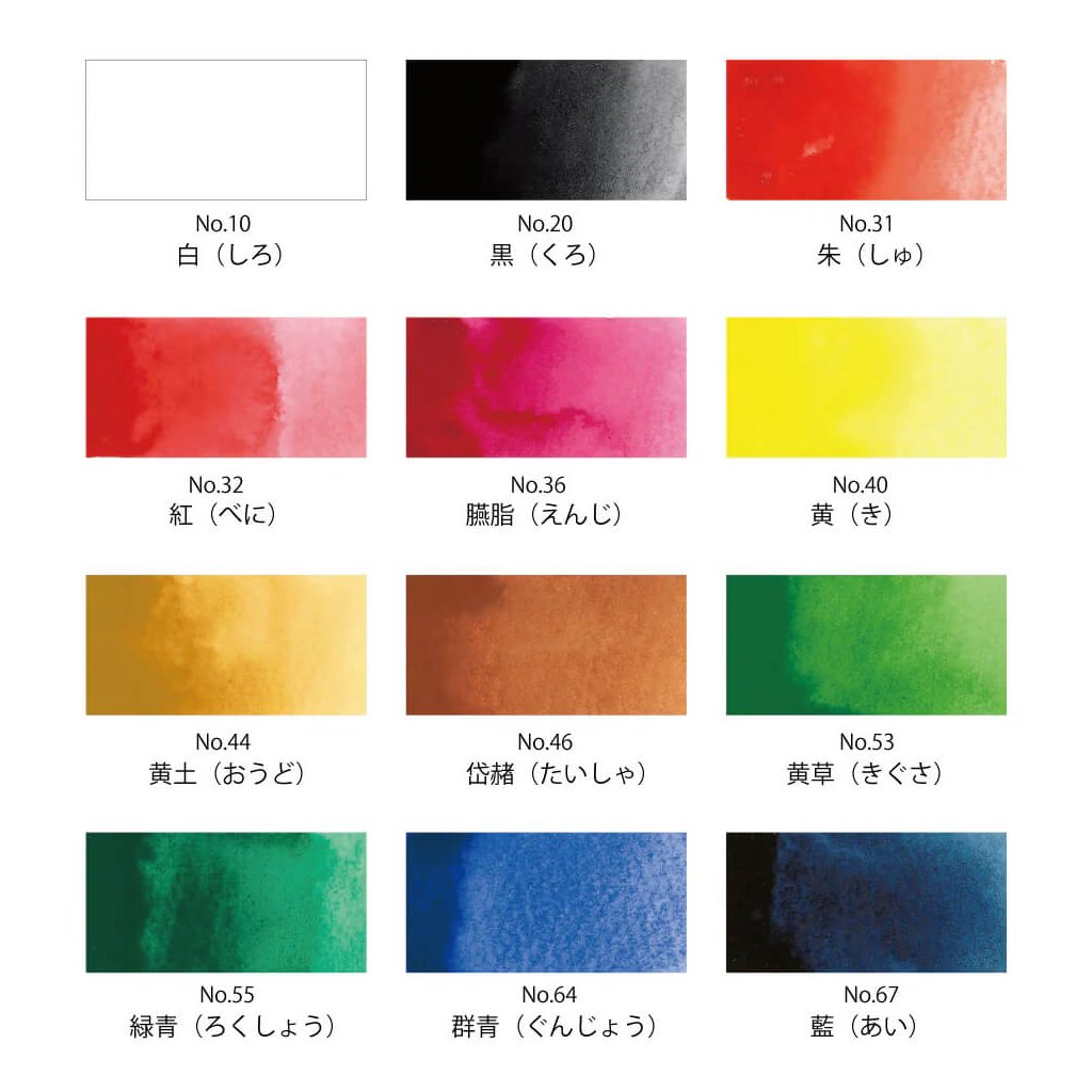 White (No. 10), Black (No. 20), Vermilion (No. 31), Red (No. 32), Carmine (No. 36), Yellow (No. 40), Ochre (No. 44), Light Brown (No. 46), Yellow Green (No. 53), Turquoise (No. 55), Ultramarine (No. 64), Indigo (No. 67)