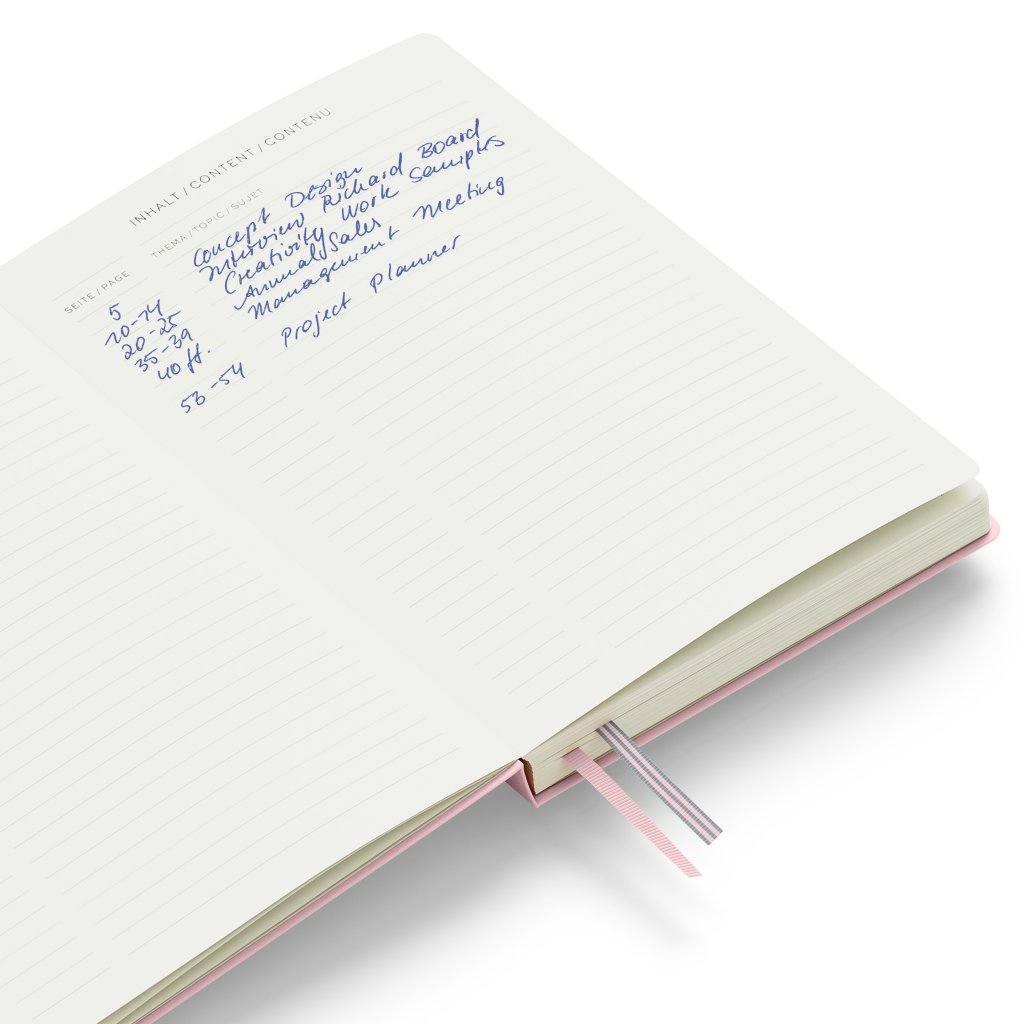 The medium A5 format (145 × 210 mm) is the most popular size of this brand. It offers the perfect balance between portability and enough space for writing. When opened, it lies perfectly flat and the double page can easily be copied onto A4 paper.