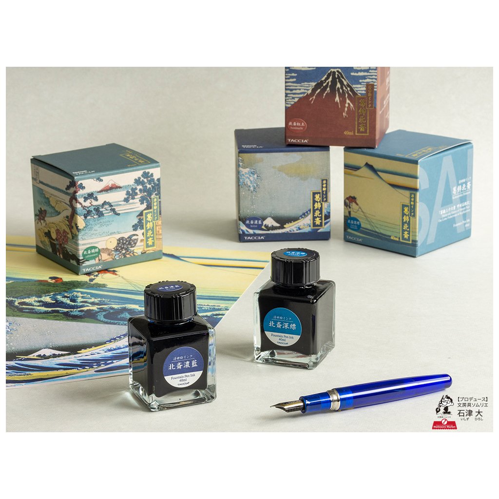 The colours used in Ukiyo-e prints are subtle, layered, and difficult to describe with a single word. Taccia Ukiyo-e inks faithfully reproduce these delicate tones, allowing writers and artists to rediscover them through writing and drawing. Each collection is named after a renowned Japanese artist—Hokusai, Sharaku, Hiroshige, and Utamaro—with colours reflecting their distinctive palettes and moods.