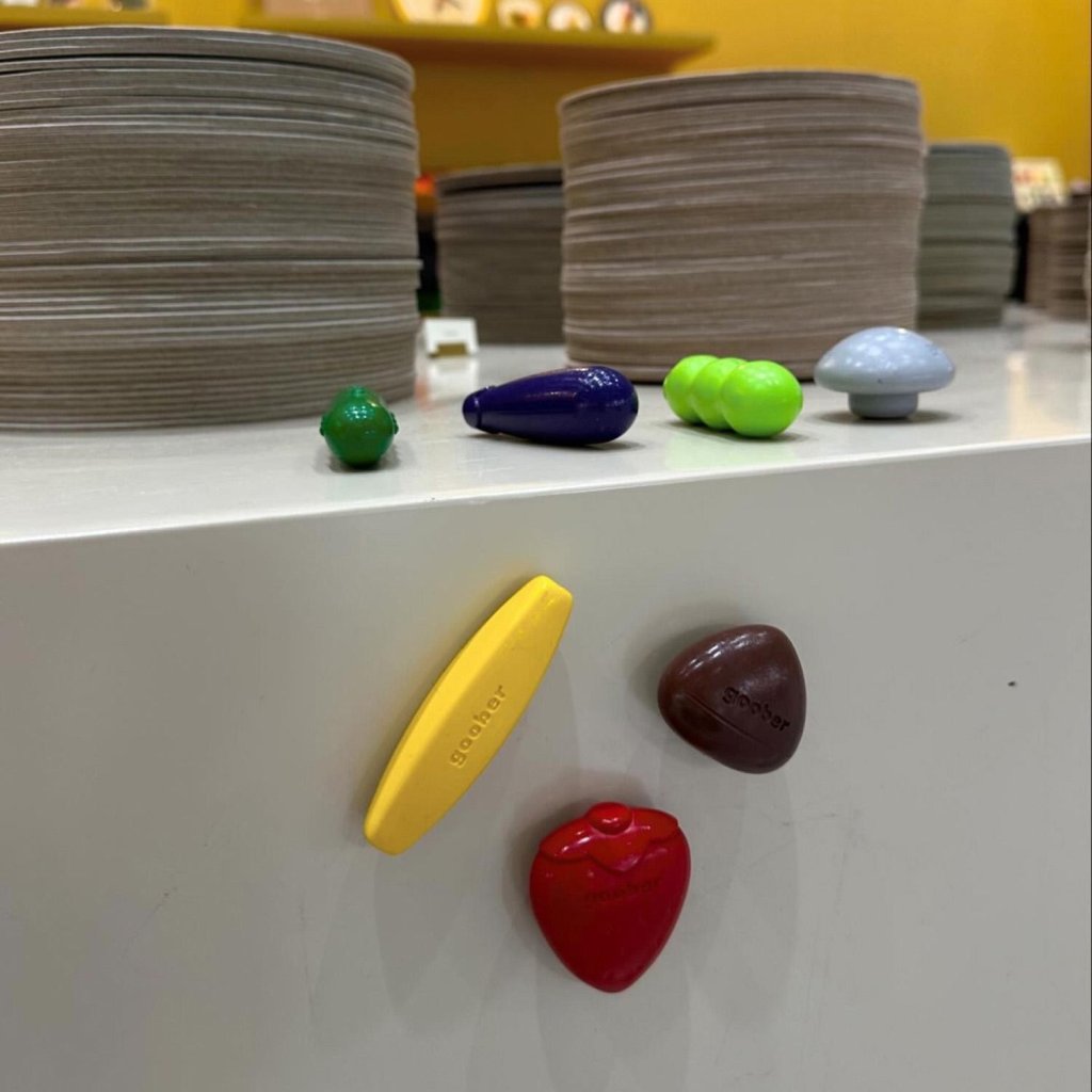 Magnetické pastelky goober spojují kreslení a každodenní hravost do jednoho malého předmětu. Jsou vyrobeny z pevného, nízce barvícího vosku, který dobře kreslí a zároveň slouží jako magnet. Pastelka tak snadno drží na kovových plochách – na lednici, magnetické tabuli nebo kovové části pracovního stolu – a je vždy připravena k použití.