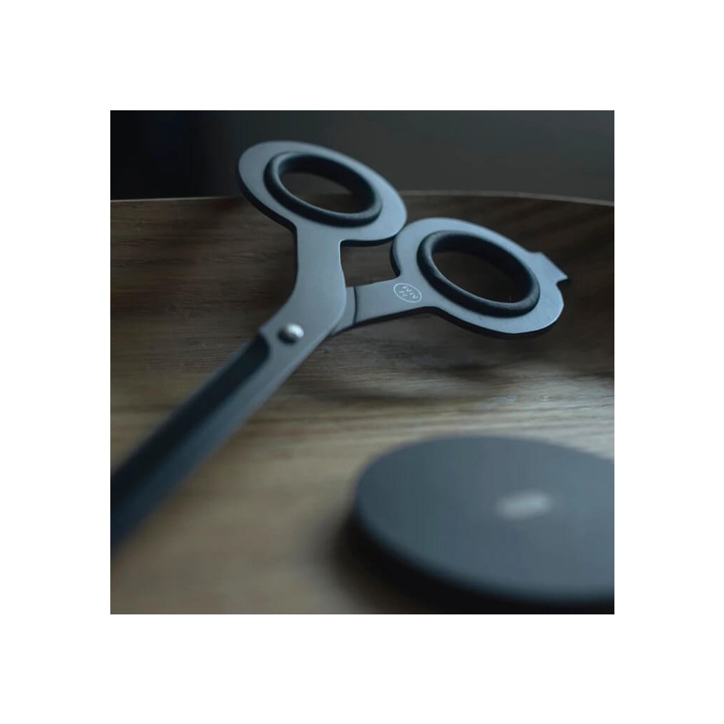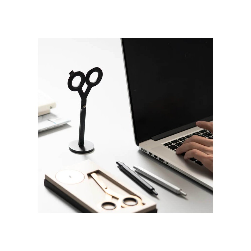 Součástí setu je také elegantní magnetická hliníková základna, která slouží jako stylový stojánek. Díky magnetu drží nůžky pevně na místě a zároveň vystavené – protože krásné nástroje si zaslouží být vidět.