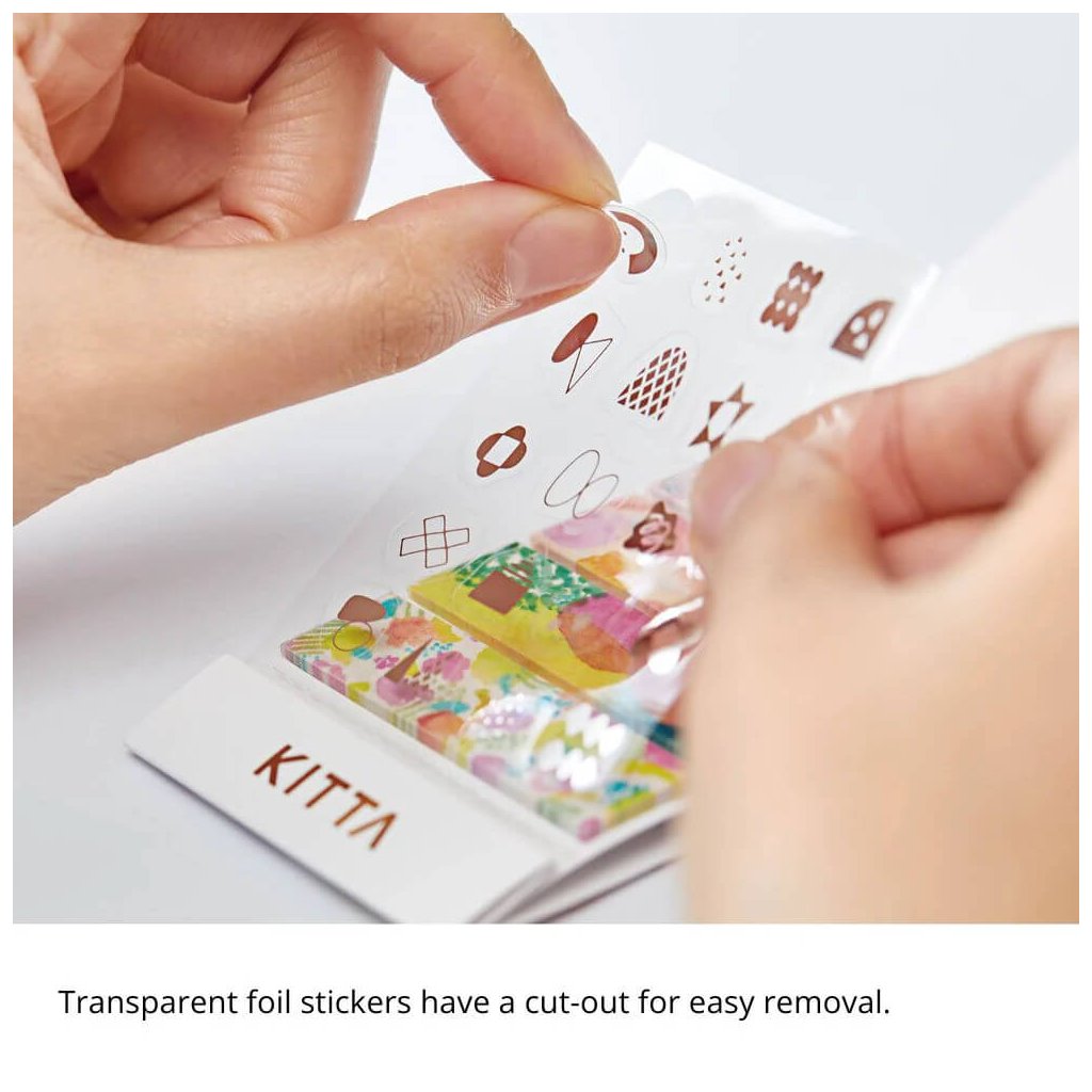KITTA Collage je kreativní řada washi pásek a transparentních fóliových samolepek, navržená speciálně pro vrstvení a kolážovou práci. Kombinuje jemné washi pásky s průhlednými samolepkami, které lze libovolně překrývat a vytvářet tak bohaté, hravé kompozice.