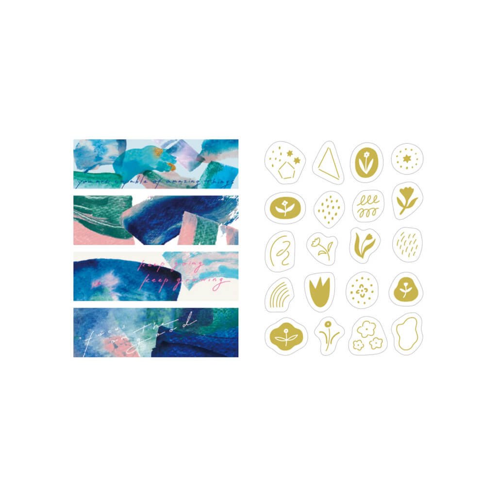 Každá sada obsahuje několik designů washi pásek doplněných o transparentní PET samolepky, které dodávají kolážím hloubku, světlo a pohyb. Díky průhlednému materiálu lze jednotlivé motivy snadno kombinovat bez ztráty čitelnosti podkladů.