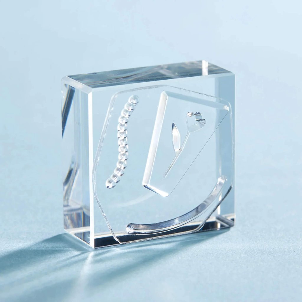 Každé razítko je vyrobeno zcela z čirého akrylu a svým vzhledem připomíná malou kostku ledu. Minimalistické, průhledné provedení umožňuje dokonalý přehled o umístění razítka, díky čemuž je snadné přesné razítkování, vrstvení motivů i vytváření složitějších kompozic.