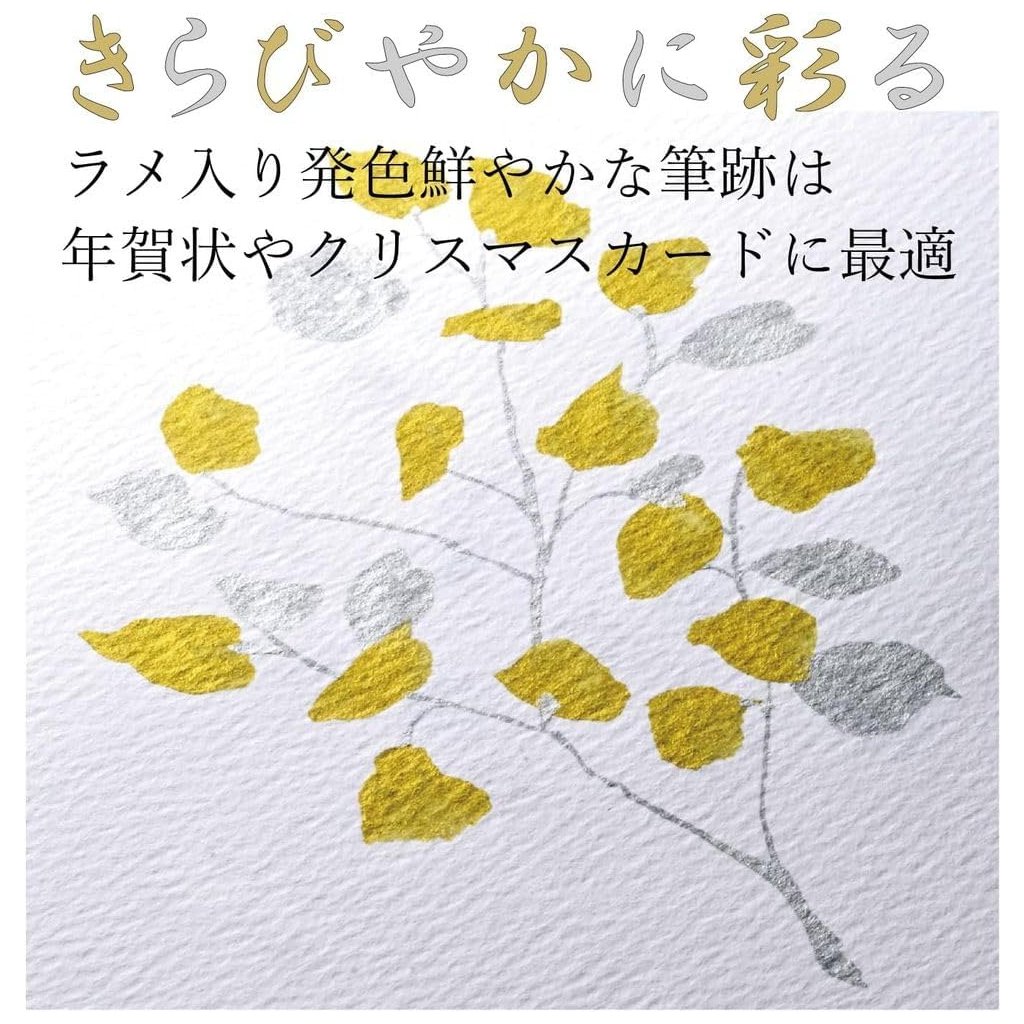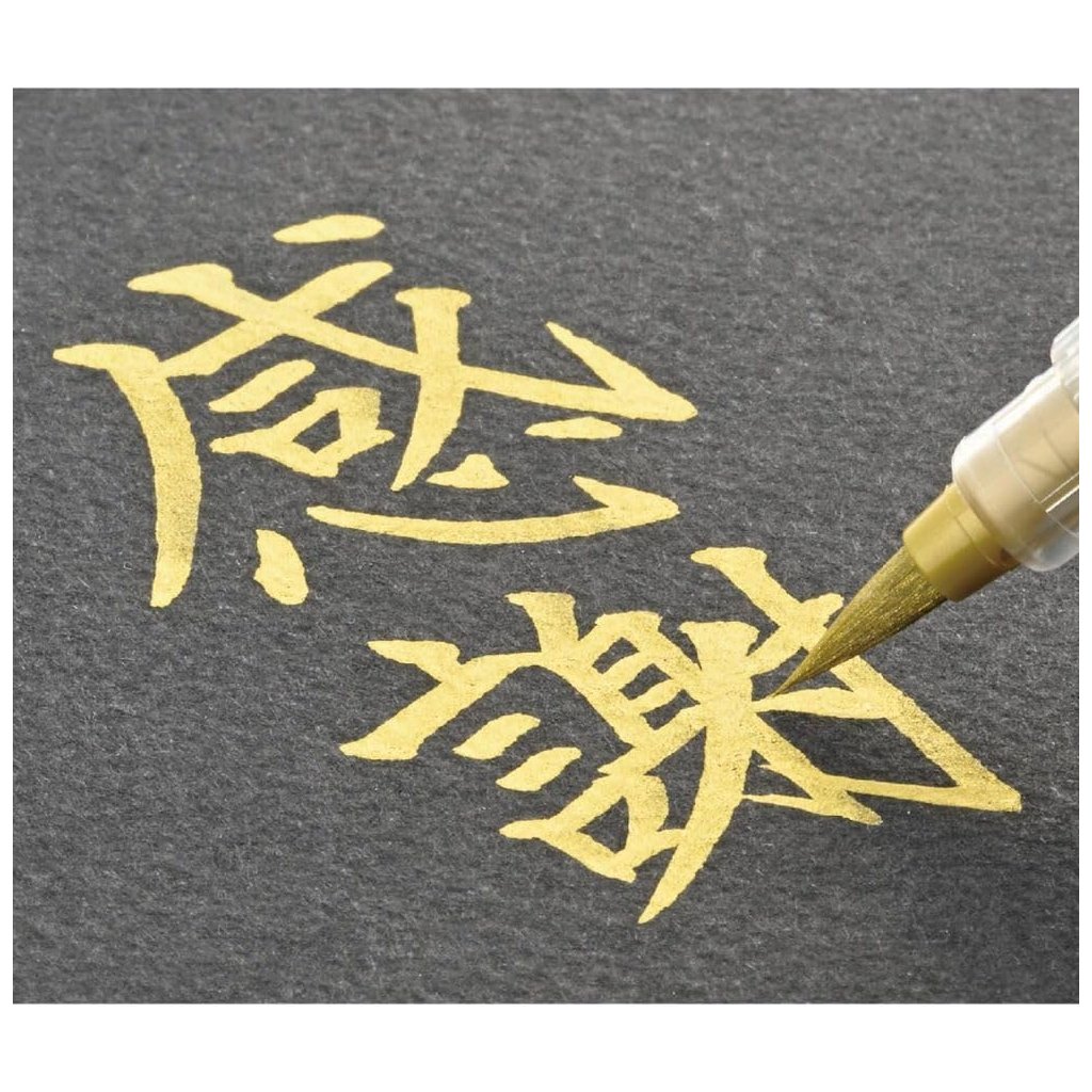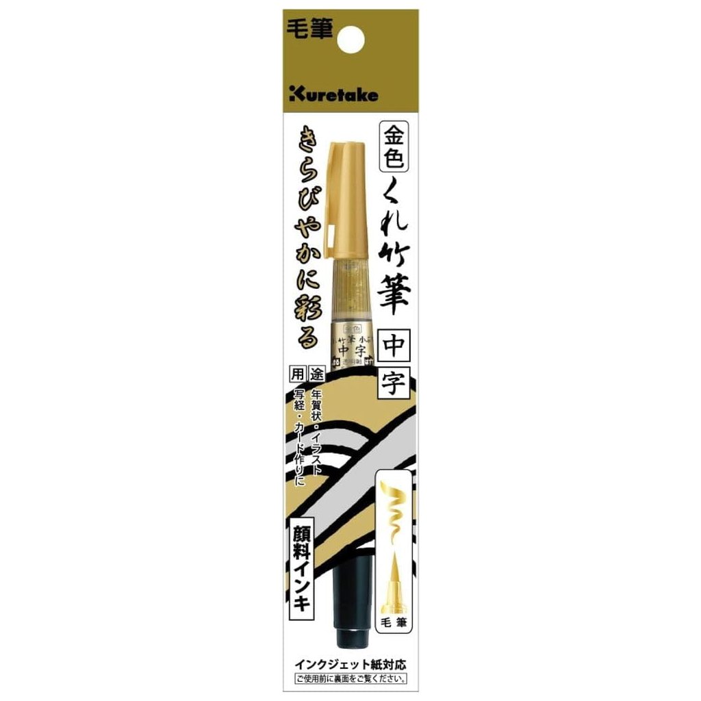 Kuretake Fude Pen – zlaté je štětcové pero s měkkým hrotem a vodou ředitelným pigmentovým inkoustem, který vyniká krásným zlatým leskem. Inkoust dobře kryje jak na světlém, tak na tmavém papíru a zůstává rovnoměrně na povrchu bez propíjení.