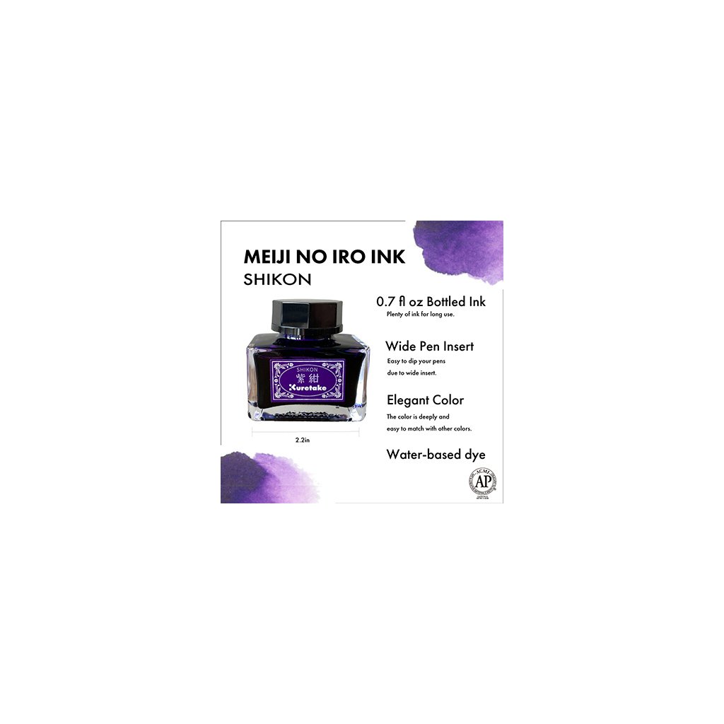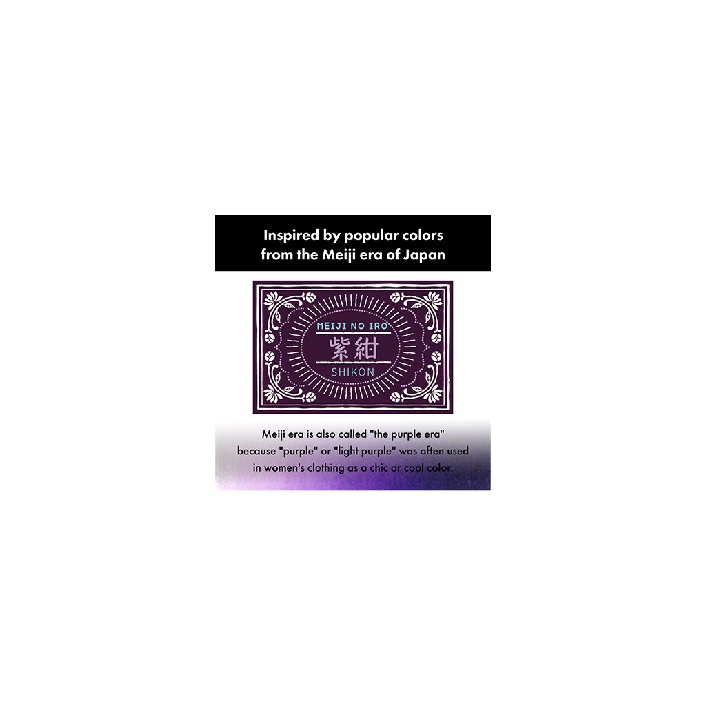 Inkoust Kuretake Ink-café MEIJI NO IRO "SHIKON" se pyšní hlubokým fialově-námořnickým odstínem, známým také jako barva „shikon“. Fialová byla v období Meidži považována za elegantní a moderní barvu, často používanou v ženské módě a známou jako symbol „éry fialové“.