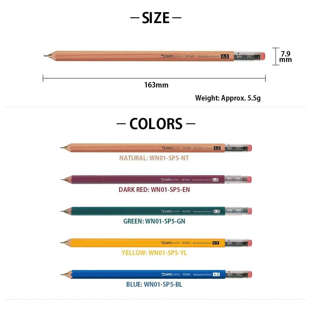 Díky standardní délce a nízké hmotnosti působí tužka v ruce přirozeně a vyváženě. Hrot o průměru 0,5 mm je ideální pro psaní poznámek, studium, kreslení i technické skici. Ohto WN01 je skvělou volbou jak pro každodenní použití, tak jako stylový dárek.