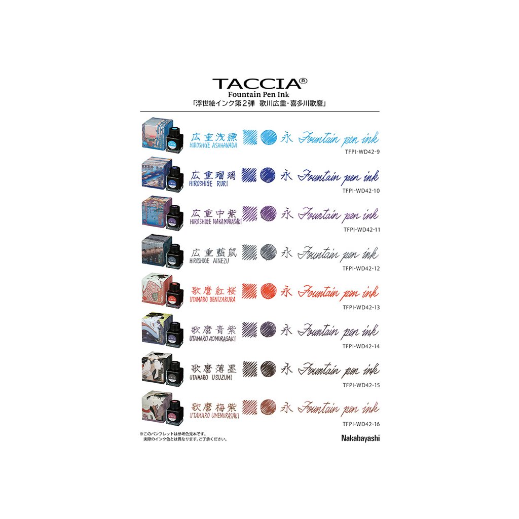 Řada Taccia Ukiyo-e je inspirována tradičním japonským uměním dřevořezu Ukiyo-e, které vzniklo v období Edo (17.–19. století). Tyto tisky zachycovaly každodenní život, přírodu, krásu i pomíjivost okamžiku – a právě tuto filozofii Taccia přenáší do světa inkoustů pro plnicí pera.