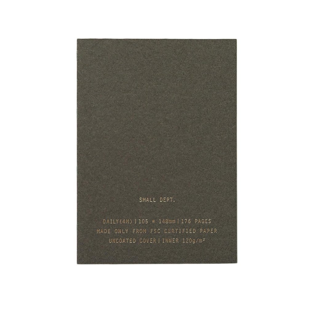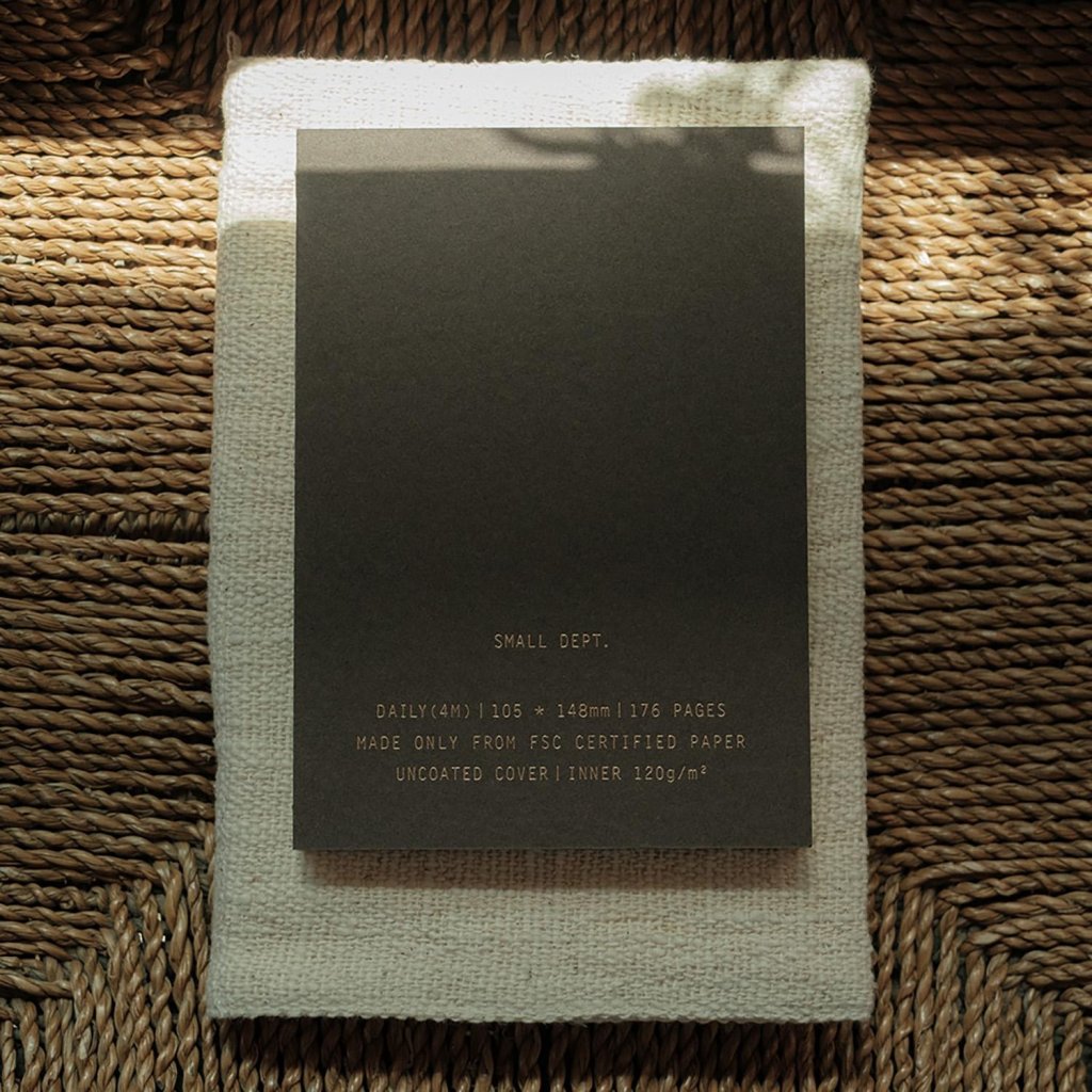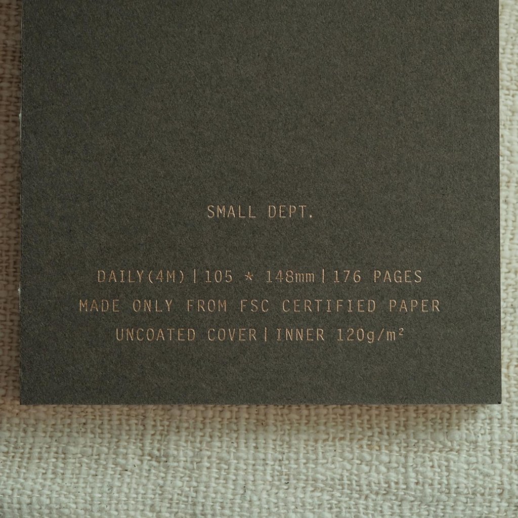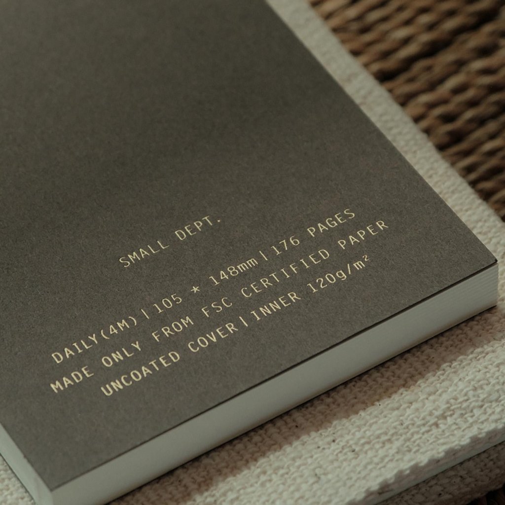 Uvnitř najdete papír Munken Pure 120 g/m², který je od září 2025 aktualizovaný pro ještě lepší práci s tužkou, propiskou i plnicím perem. Vazba se otevírá zcela naplocho, což zajišťuje maximální pohodlí při psaní. Čokoládově hnědé desky se zlatou ražbou „SMALL DEPT.“ dodávají zápisníku nadčasový, klidný charakter.